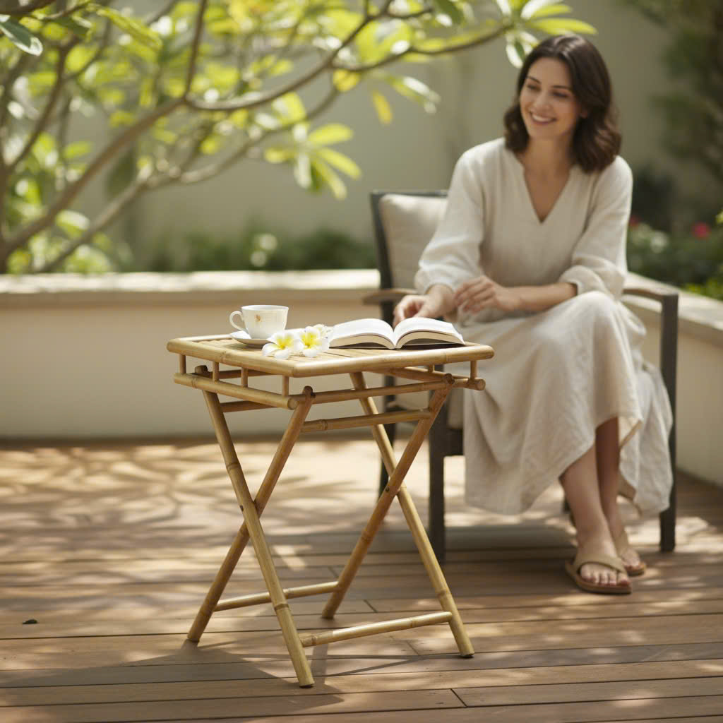 Mỗi chiếc bàn được làm thủ công tỉ mỉ bởi những nghệ nhân lành nghề, đảm bảo kết cấu chắc chắn, gọn nhẹ, dễ dàng gấp gọn và di chuyển. Thiết kế tối giản giúp bàn dễ dàng hòa hợp với nhiều không gian khác nhau – từ ban công, sân vườn cho đến phòng khách.