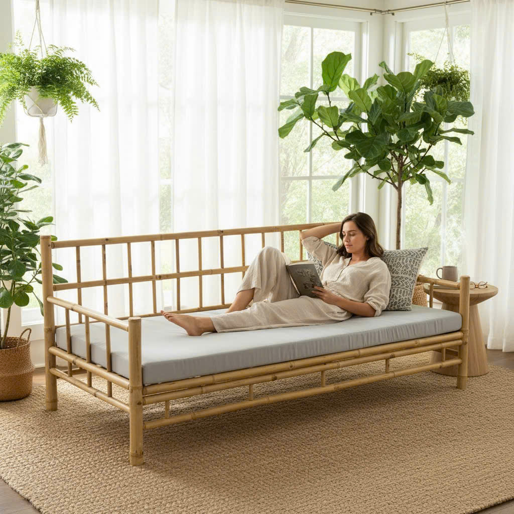 Ghế sofa/daybed bằng tre tự nhiên mang lại sự kết hợp hoàn hảo giữa phong cách nhiệt đới mộc mạc và thoải mái hiện đại, lý tưởng cho cả không gian trong nhà và ngoài trời có mái che.