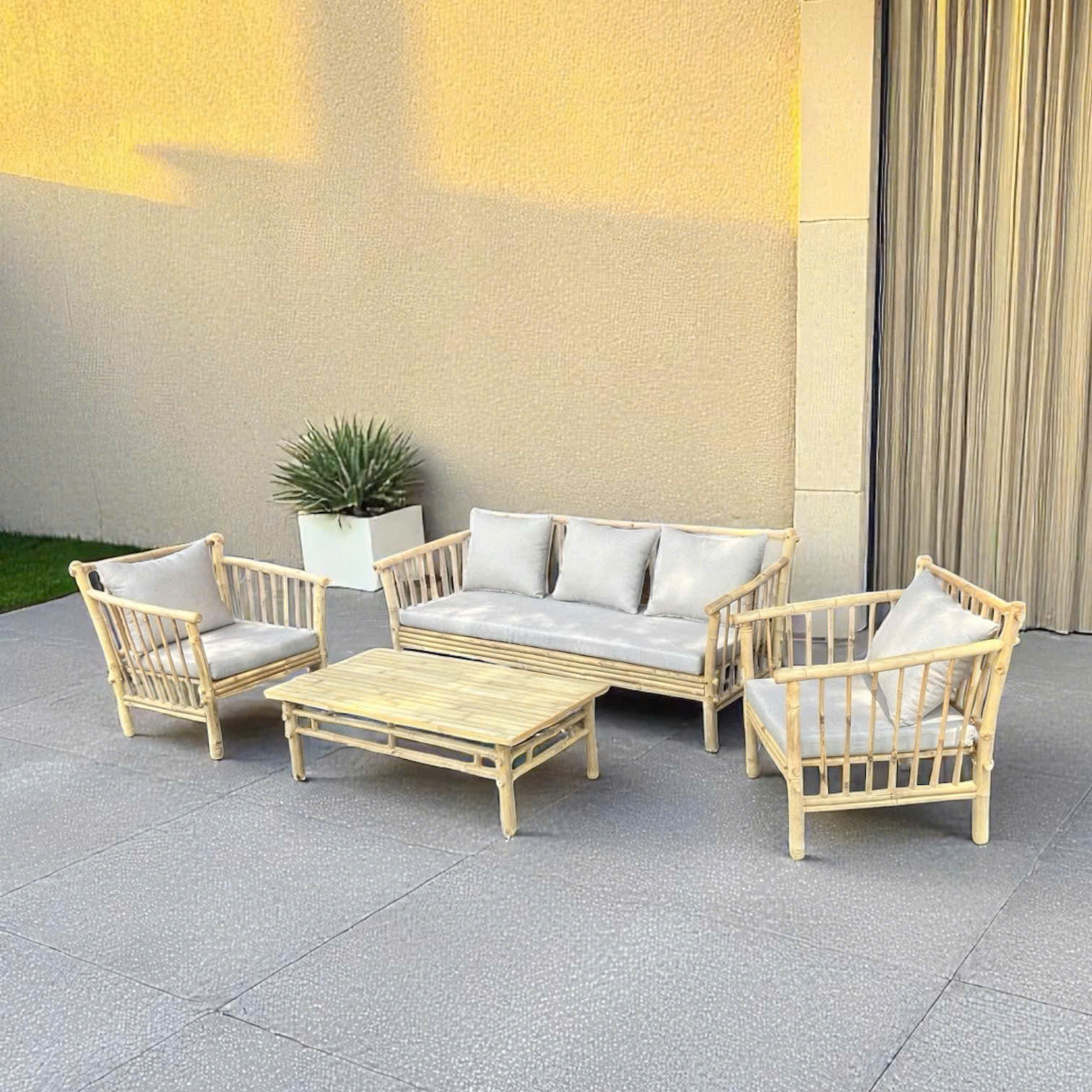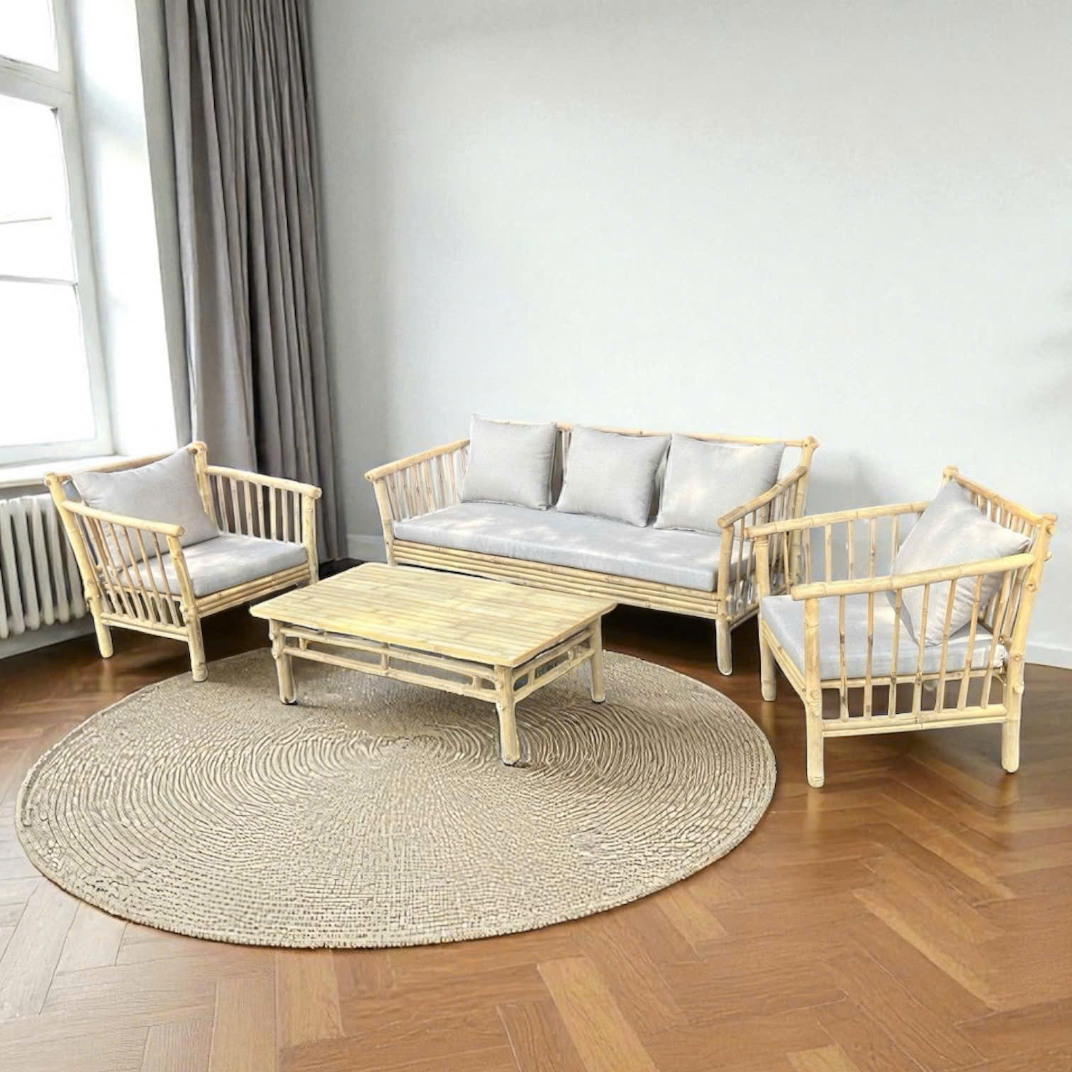 Bộ sofa phòng khách bằng tre tự nhiên bốn món, bao gồm sofa ba chỗ, hai ghế bành và bàn cà phê, mang lại phong cách nhiệt đới sang trọng và sự thoải mái lý tưởng cho không gian tiếp khách.