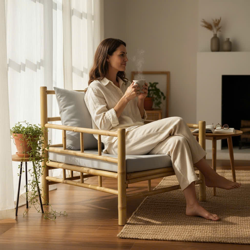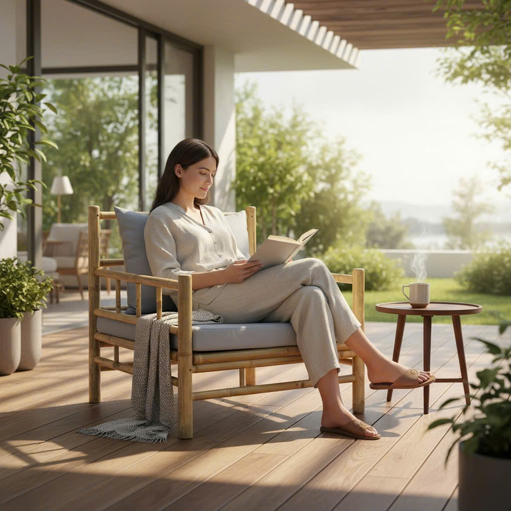 Ghế sofa đơn bằng tre tự nhiên với đệm vải màu xám nhạt, lý tưởng cho không gian trong nhà hoặc ngoài trời, mang lại cảm giác thư giãn và phong cách tối giản.