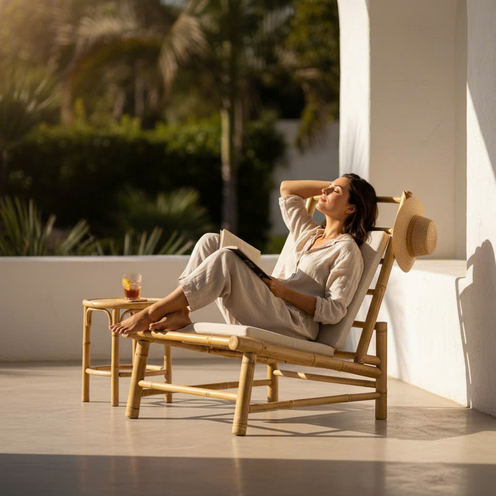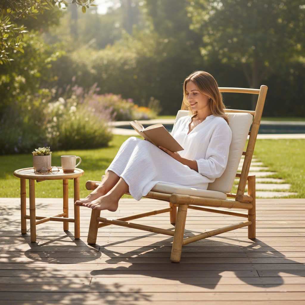 Ghế tre thư giãn thủ công — thiết kế tinh tế từ tre tự nhiên và vải mềm mại, mang đến trải nghiệm nghỉ ngơi đẳng cấp như resort ngay tại nhà.