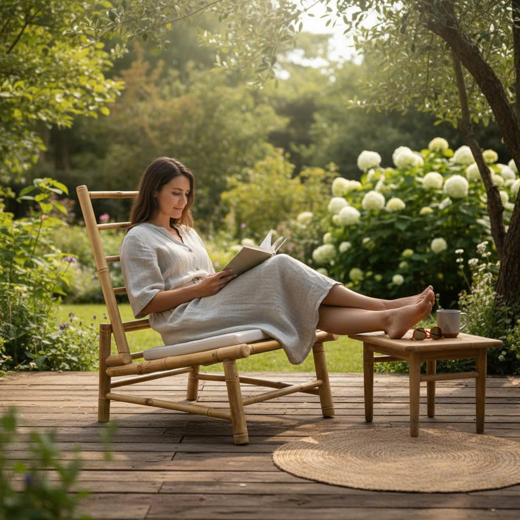 Ghế thư giãn bằng tre/mây với thiết kế thấp, lưng tựa cao và đệm ngồi êm ái, lý tưởng cho những giây phút nghỉ ngơi thoải mái cả trong nhà lẫn ngoài trời.