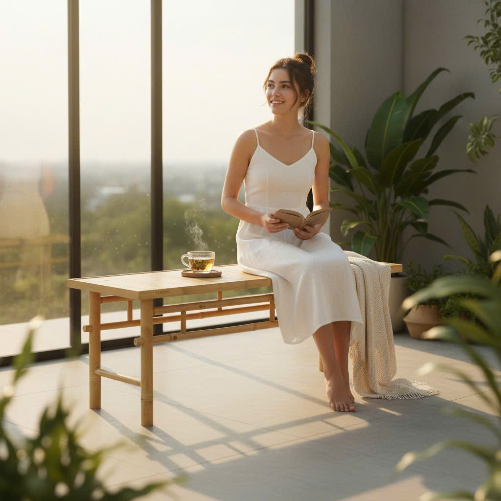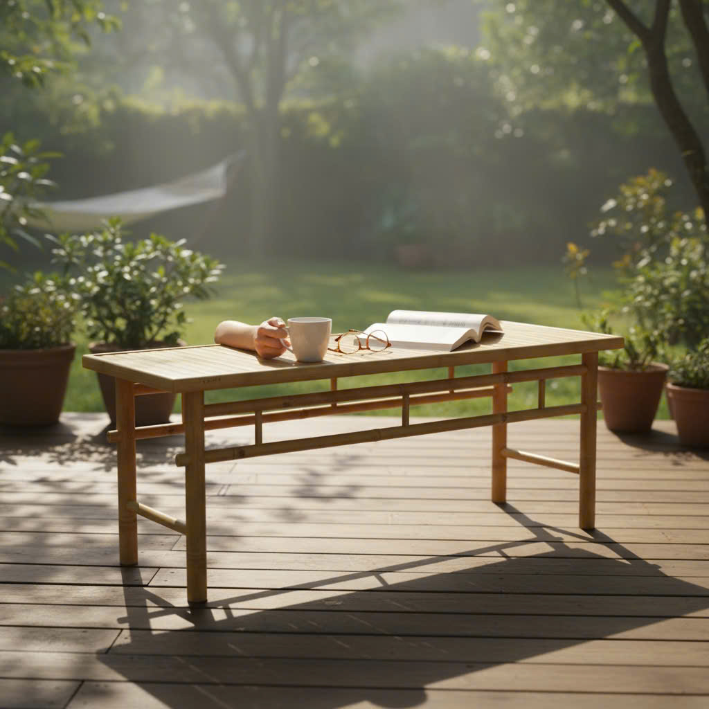 Ghế băng dài/bàn thấp bằng tre/gỗ tự nhiên với thiết kế tối giản, mặt phẳng rộng, có thể dùng làm nơi ngồi nghỉ hoặc làm bàn cà phê ngoài trời.