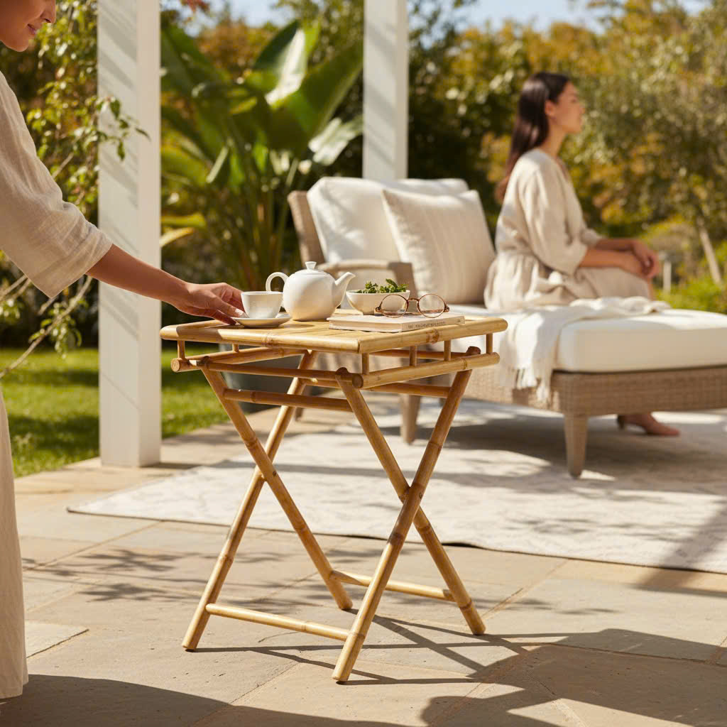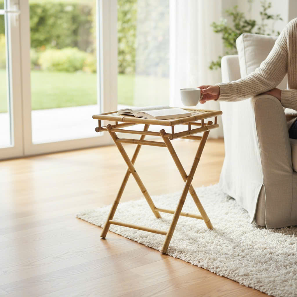 Bàn phụ tre có thể gập gọn này kết hợp sự tiện lợi và phong cách tự nhiên, lý tưởng cho việc phục vụ đồ ăn thức uống trong nhà hoặc ngoài trời.