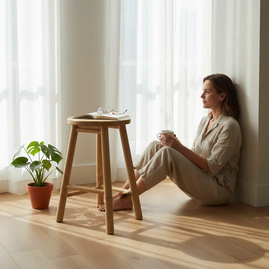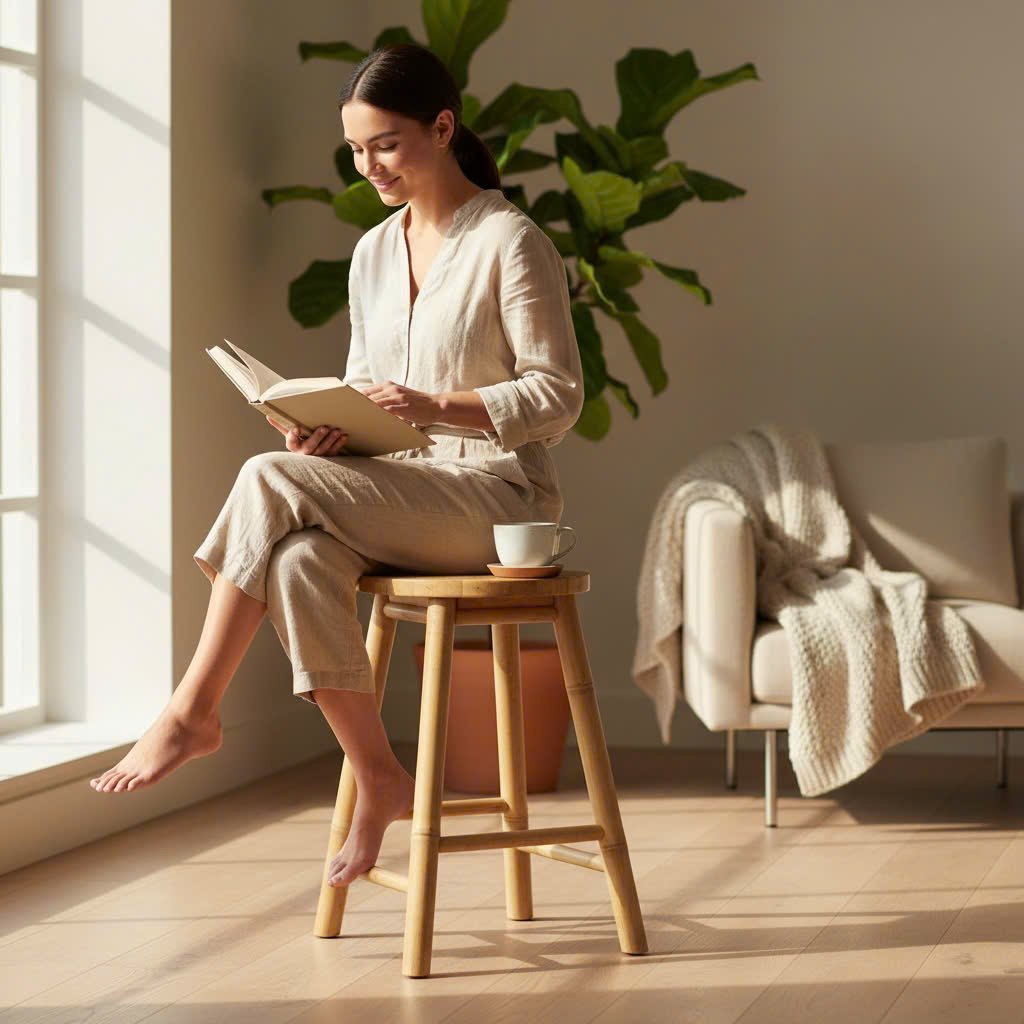 Chiếc ghế đẩu tre nhỏ gọn này là món đồ nội thất đa năng, hoàn hảo để làm ghế ngồi hoặc bàn phụ trong mọi không gian sống hiện đại.