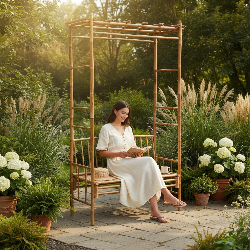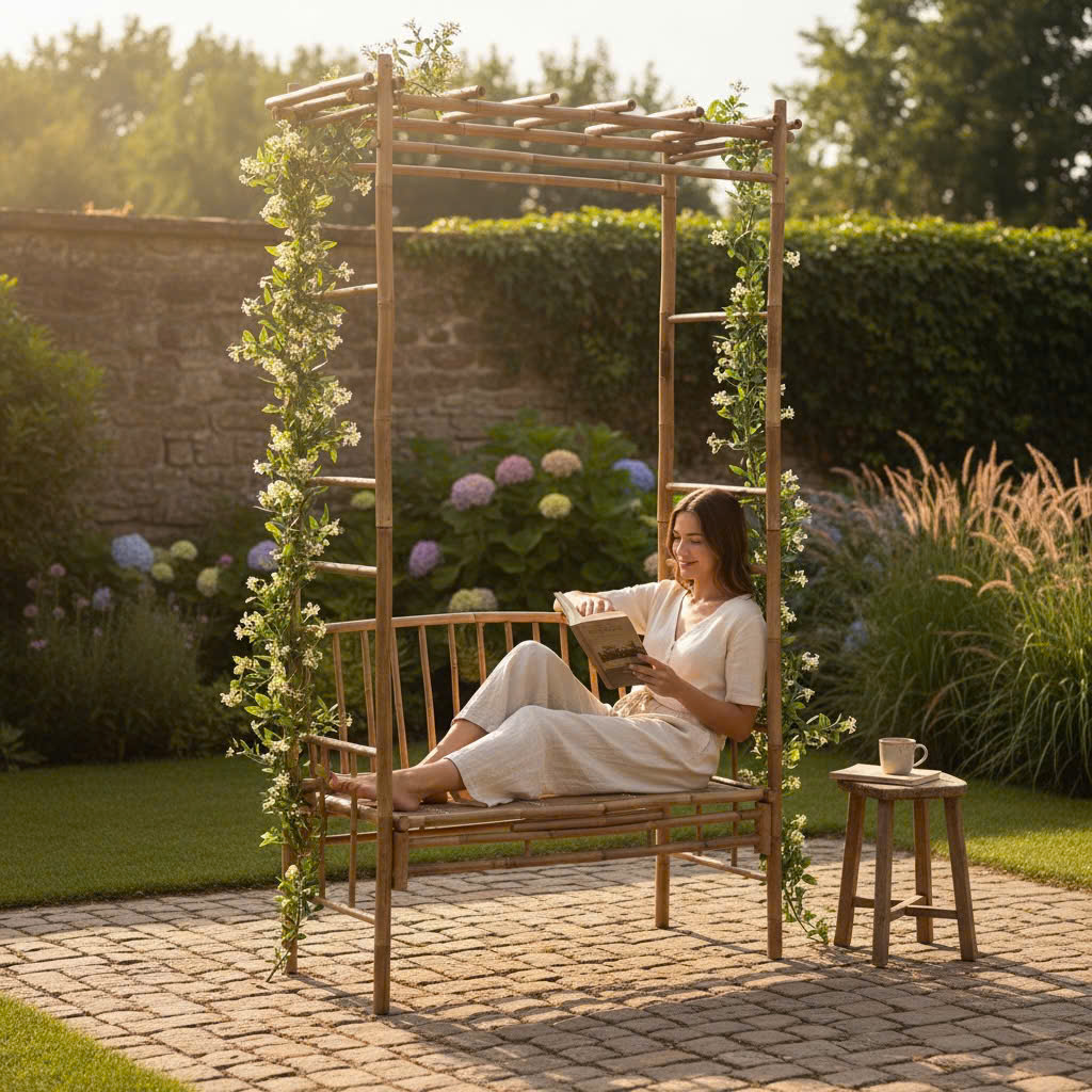 Ghế băng bằng tre tự nhiên kết hợp giàn leo, tạo không gian thư giãn lý tưởng và gần gũi với thiên nhiên cho khu vườn của bạn.