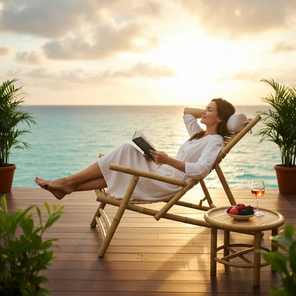 Chiếc ghế thư giãn/tắm nắng bằng tre tự nhiên này mang lại sự thoải mái hoàn hảo với thiết kế điều chỉnh được và gối tựa đầu êm ái, lý tưởng để tận hưởng những giây phút thư thái ngoài trời.